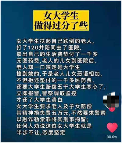 某平臺(tái)曾經(jīng)有這么一個(gè)短視頻,引起幾十萬的點(diǎn)贊。一個(gè)女大學(xué)生扶起一位自己跌倒的老人,并打120陪同老人去了醫(yī)院,還先期墊付了1000多的藥費(fèi);結(jié)果是什么?老人的兒女到了醫(yī)院后,被扶的老人卻一口咬定撞倒他的是女生,所以老人子女不僅沒有感謝女學(xué)生,反而惡語相向,拒不返還前期墊付的藥費(fèi),還要向女生索賠5000元。